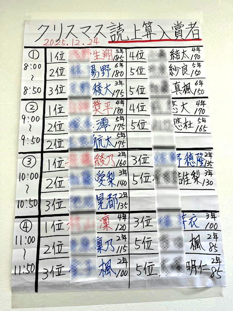 発熱で欠席した1名(残念!)を除き、参加者は5名。厳しい出場基準を乗り越えた、6年生4名・4年生1名です。競うのは「総合(×・÷・みとり暗算)「読上暗算」「読上算」の3種目。2ヵ月間頑張って練習した成果を出すべく、皆頑張ってくれました。